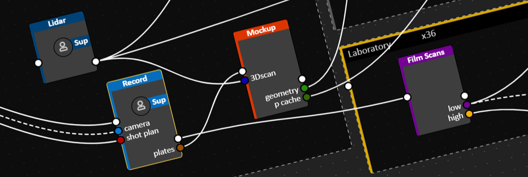 Potente herramienta nodal para que puedas representar tus pipelines, el flujo de archivos y el código de transformación de tus producciones.