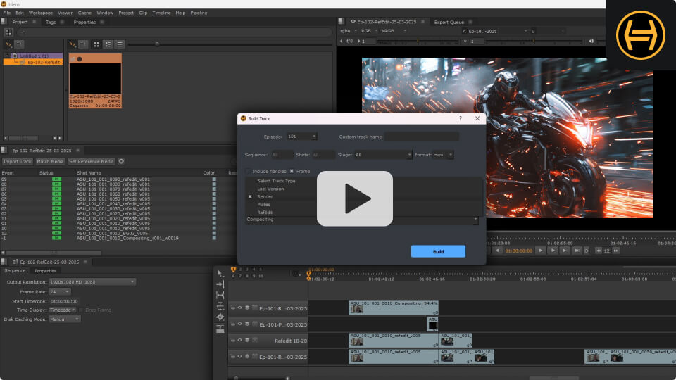 Crea scripts de Nuke desde la ingesta, basados en los parámetros del shot y del proyecto. Configura automáticamente nodos read para plates, cámaras y 3D, y nodos write para revisión editorial.