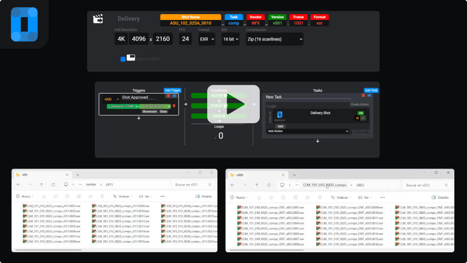 ¿Necesitas enviar datos a Shotgrid o Ftrack? Solo añade una acción al proceso. Configurable fácilmente por tus TDs. Si no tienes, nuestro equipo te ayuda o forma.